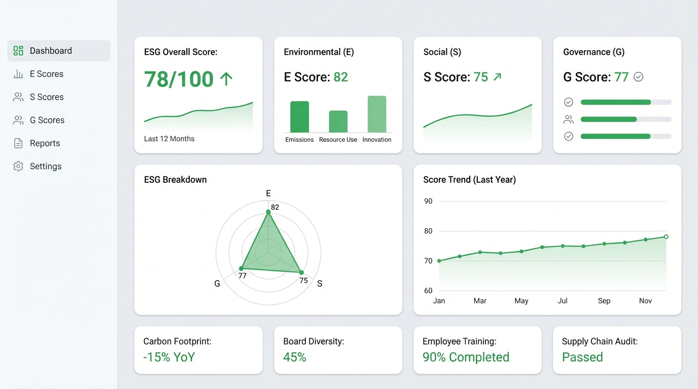 - Dashboard theo dõi điểm sốTrực quan hóa điểm ESG qua biểu đồ radar, trend line và KPI cards