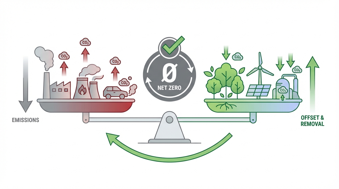Net Zero là trạng thái khi tổng lượng phát thải khí nhà kính được cân bằng thông qua các biện pháp giảm phát thải và bù đắp carbon.